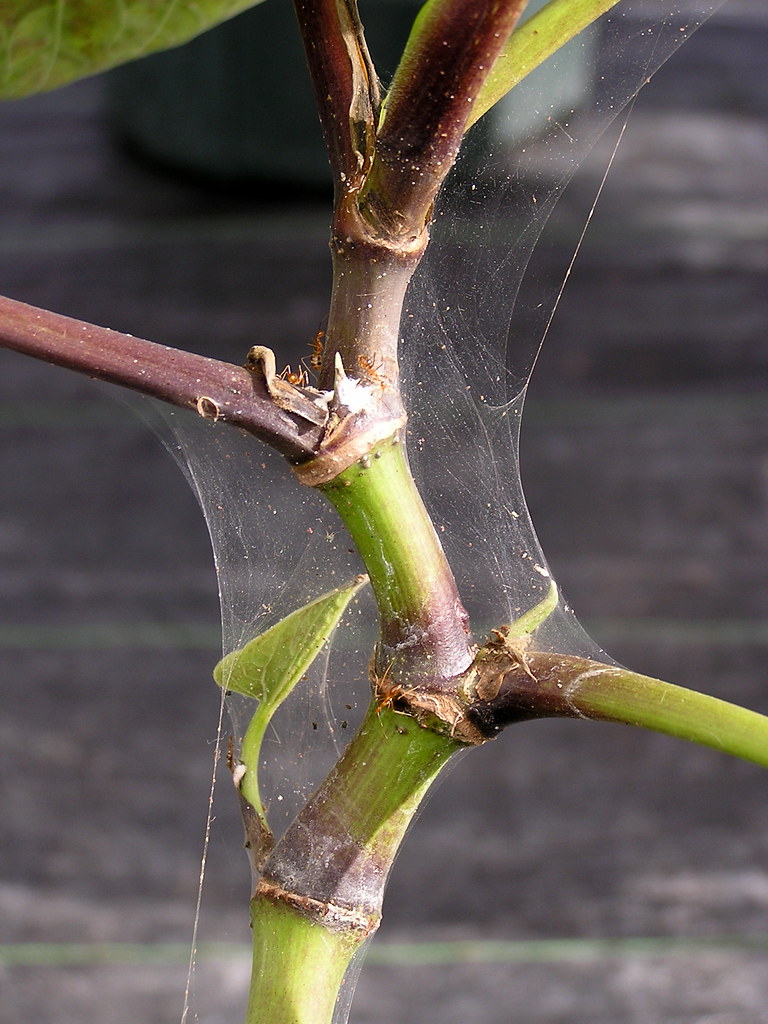 Description: Tiny arachnids, often red or brown, that form fine webs on leaves. They puncture plant cells to feed.